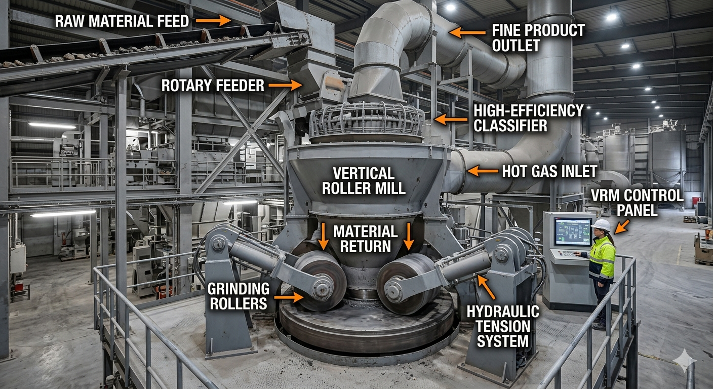 In heavy industries such as cement production and power generation, the demand for high-throughput and low-energy machinery has never been higher. The Vertical Roller Mill addresses these needs by combining four distinct processes into one unit. Below is a detailed breakdown of its operational advantages: